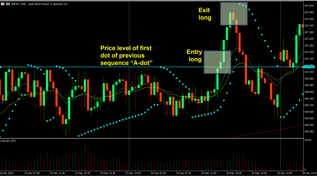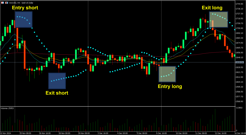 By plotting dots above or below the price, the indicator facilitates traders to identify potential reversal points in the market that can theoretically be used as the basis for long or short strategy entry points and, of course, for exit also.